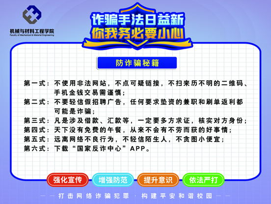 在宿舍里,辅导员老师结合以往案例向同学们重点讲解“网络兼职刷单”、“网络游戏诈骗”、“校园贷诈骗”等几种大学校园中常见的诈骗形式,揭露虚假网购骗术,帮助大家识别多样诈骗手段,为大学生的校园安全生活“支招”。学生们认真倾听、积极互动,并表示今后努力做到防骗、识骗和拒骗。同时机材学院学工办精心准备了防范诈骗宣传海报,发放并张贴在每个学生宿舍。