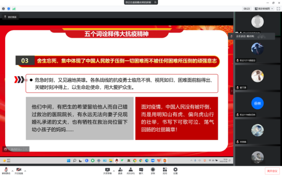 本次党课戴静老师围绕回顾抗疫斗争重大战略成果、五方面阐述抗疫“制胜密码”、中国精神、中国力量、中国担当、五个词诠释伟大抗疫精神、抗疫斗争伟大实践的六大深刻启示、不断开创党和国家事业发展新局面等六个方面展开,她指出在这次抗疫斗争中,青年一代的突出表现令人欣慰、令人感动。参加抗疫的医务人员中有近一半是“90后”、“00后”,世上没有从天而降的英雄,只有挺身而出的凡人。青年一代不怕苦、不畏难、不惧牺牲,用臂膀扛起如山的责任,展现出青春激昂的风采,展现出中华民族的希望,让我们更加紧密地团结起来,大力弘扬伟大抗疫精神,勠力同心、锐意进取,在全面建设社会主义现代化国家的新征程上贡献青春力量!