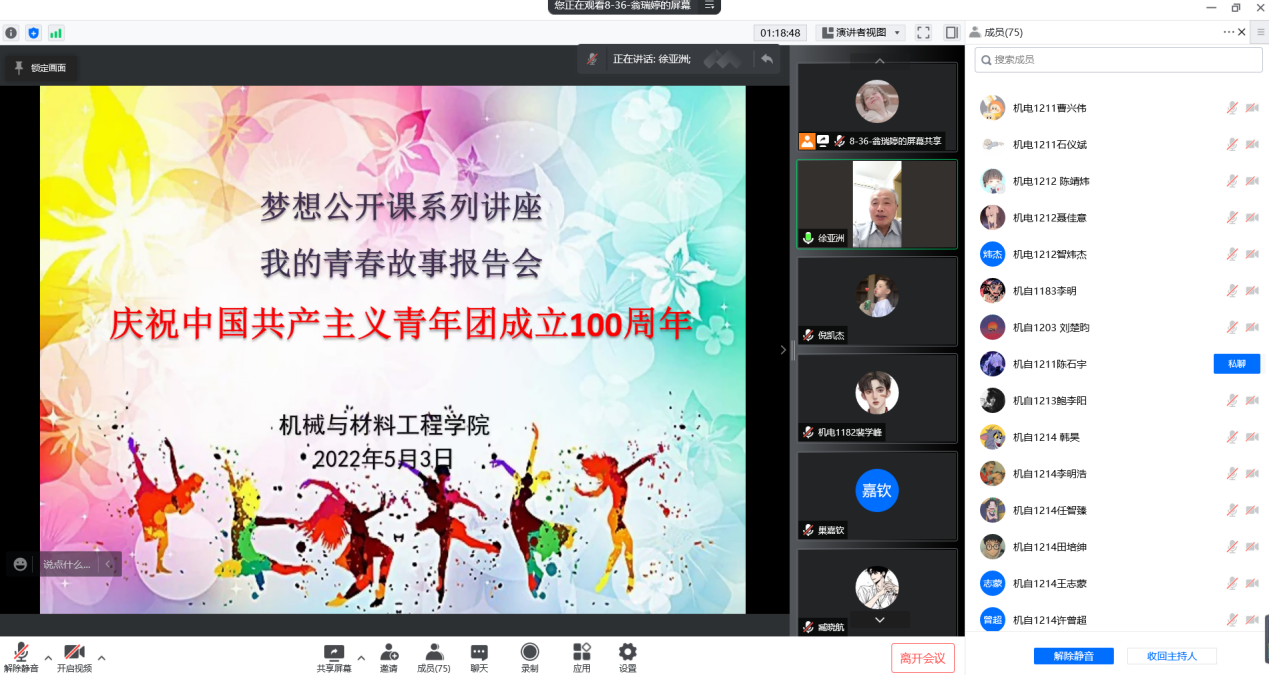 为庆祝中国共产主义青年团成立100周年,发挥优秀团员的先进典型作用,5月3日晚7:00,williamhill英国在腾讯会议APP开展我的青春故事报告会暨梦想公开课系列讲座之优秀学生事迹宣讲活动。李明、陆建勋、刘奇、裴学峰四位优秀学生代表进行了事迹分享。学院关工委副主任徐亚洲受邀参加活动并讲话,学院学工办主任郁大同、团委副书记郭巧会和学院大一至大三一百余名同学参加了活动。