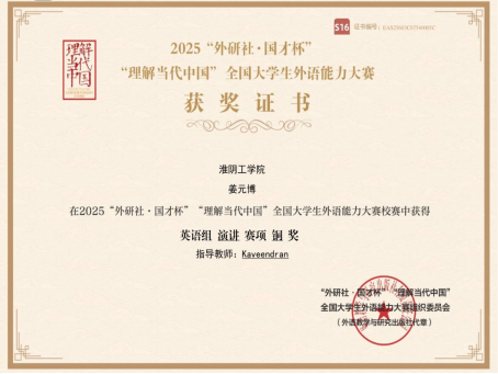 近日,2025“外研社·国才杯”“理解当代中国”全国大学生外语能力大赛校赛结果揭晓,我校姜元博同学在英语组演讲赛项中凭借出色的表现,斩获铜奖,指导教师为Kaveendran。