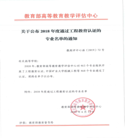 6月13日,教育部高等教育教学评估中心正式发布《关于公布2018年度通过工程教育认证的专业认名单的通知》(高教评中心函[2019]12号),公布了2018年全国工程教育专业认证的认证结论。2018年,全国共有463个专业接受了认证工作,经过学校自评、专家组现场考查、分委员会(试点工作组)审议、认证结论审议委员会审议等程序, 共有460个专业通过认证。我校机械设计制造及其自动化专业名列其中,认证时效为6年,自2019年1月至2024年12月。