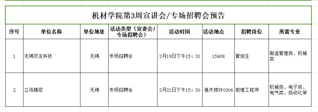 机材学院第3周宣讲会/专场招聘会预告