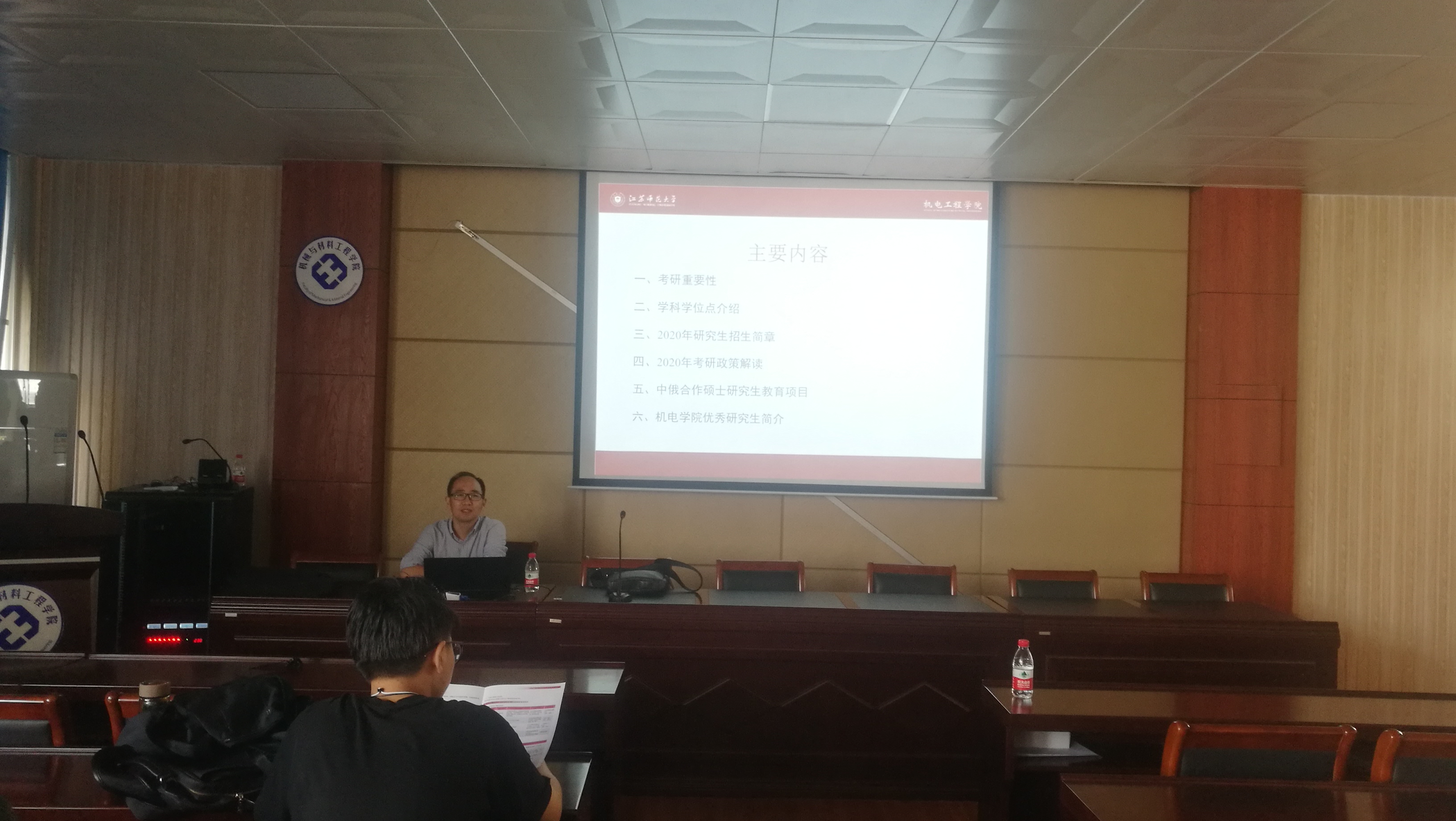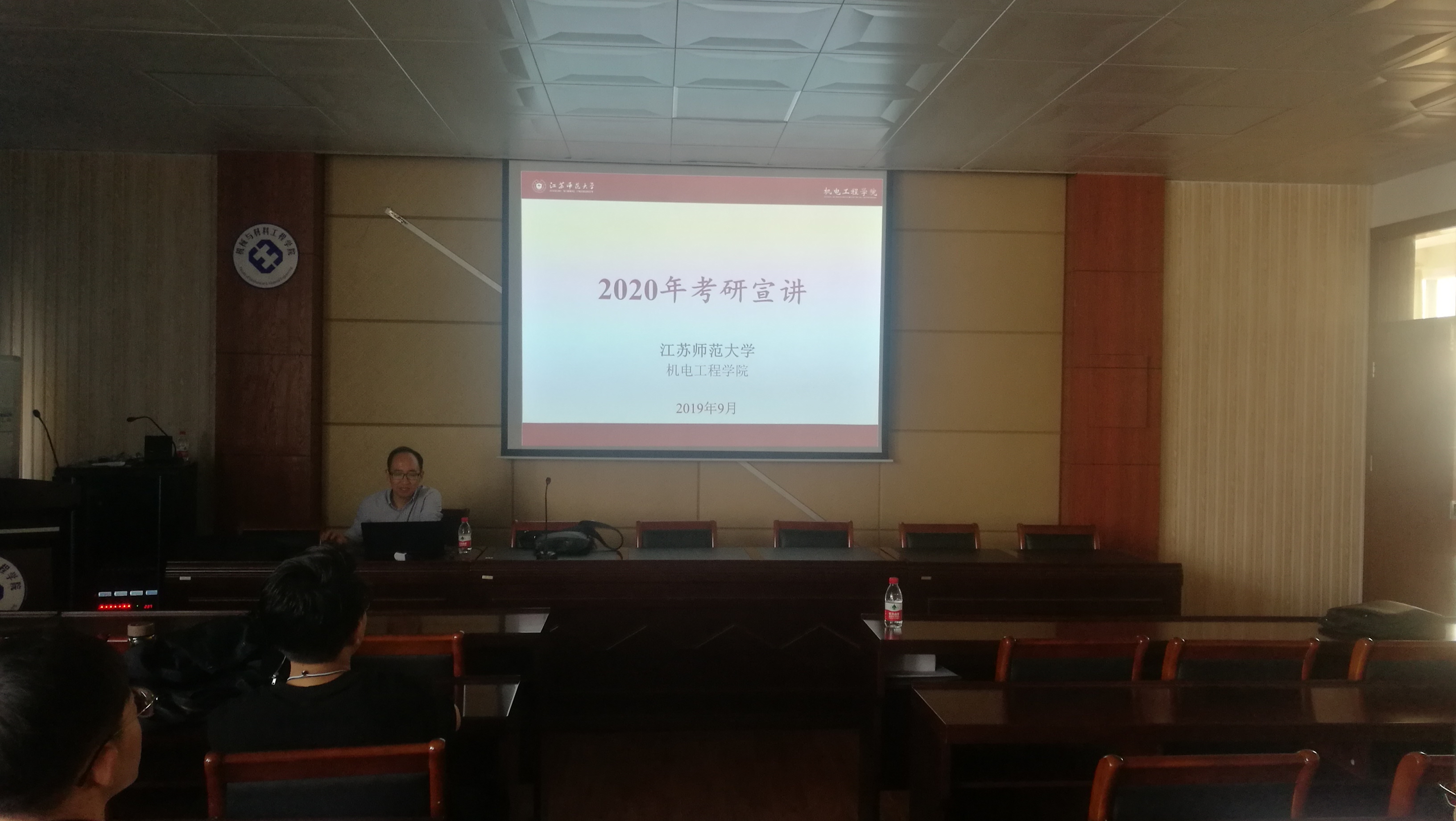 9月24号上午在15410报告厅,江苏师范大学机电工程学院张亮副院长一行来我院举行2020年研究生招生宣讲会,我院党委李炜副书记、部分16级考研同学参加,会议由学工办郁大同主任主持。