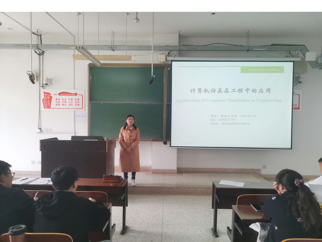 师访老师从“有限元工程应用——机械行业”、“工程应用——土木,矿业”、“有限元软件ANSYS”、“流体动力学仿真CFD”、“分子动力学仿真”、“天体物理学仿真”、“EDA电子设计自动化软件”七个方面为同学们展示了计算机仿真在实际生活中与实际工程中的应用方式及作用。他通过展示空调外机支架、战斗机构造等计算机仿真建模图片以及汽车碰撞、小球入水等计算机仿真视频,激发同学们的兴趣,着重强调计算机仿真是当今世界上极具竞争力的专业,且具有良好的发展前景,并举例美国安捷伦科技、中国恒为科技等优秀公司,为同学们的日后发展提供了建设性的建议。