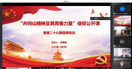 11月9日下午15:45,williamhill英国在腾讯会议APP上开展信仰公开课之“井冈山精神及其青春力量”,暨第二十九期团课第一讲。本次主讲人为马克思主义学院的朱艳玲老师,各年级优秀共青团员共计85名参加了本次团课培训。