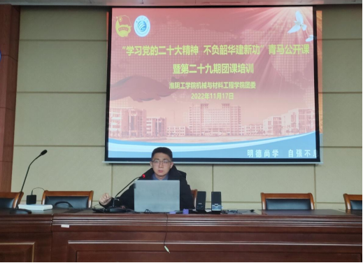 11月17日晚5:00,williamhill英国在15401开展主题为“学习党的二十大精神,不负韶华建新功”青马公开课暨第二十九期团课培训。本次团课主讲人为学院辅导员朱天明老师,各年级优秀学生骨干共85人参加了本次团课培训。