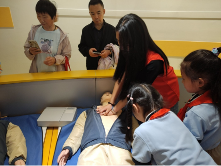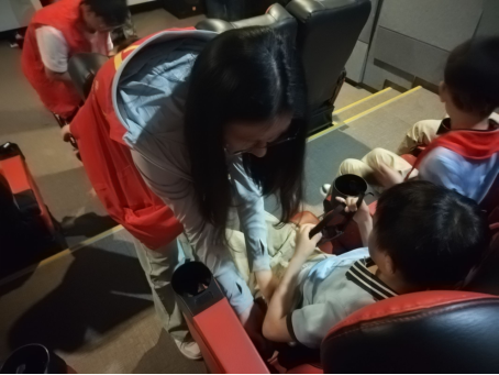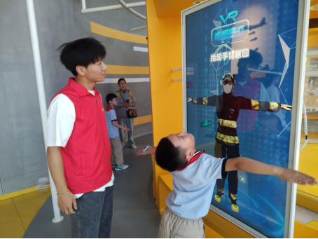 志愿者们提前到达场地熟悉环境和操作环节。在活动过程中,每位小朋友都十分兴奋,志愿者们也非常热情地组织队伍有序进行参观。志愿者们带领小朋友们体验体感换衣互动游戏,在5D影院观看安全动画影片,指导小朋友们系解座椅安全带,教授心肺复苏方式,还开展了电梯骤降和地震模拟体验。