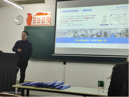 江苏隆达超合金股份有限公司招聘岗位有研发工程师、产品工程师、工艺工程师、销售工程师、市场专员等。所需专业:金属材料、冶金、机械、国际贸易、英语等相关专业。企业代表采用了交流会的形式在会议室与同学们进行了深度交流,代表人在介绍公司情况的同时,给同学们提供了一些建议,并现场解答了同学们的问题。