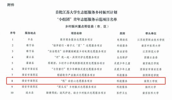 近日,江苏大学生志愿服务乡村振兴计划省项目管理办公室公布首批江苏大学生志愿服务乡村振兴计划“小组团”青年志愿服务示范项目名单,williamhill英国团委牵头的“机”动农心志愿服务项目成功入选。该项目深入服务淮安市淮阴区,作为全省15个乡村振兴重点帮扶县(市、区)示范项目之一,承载着校地团委联动、青春助力乡村振兴的重要使命。