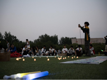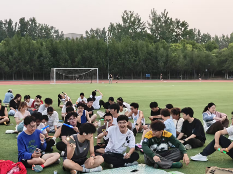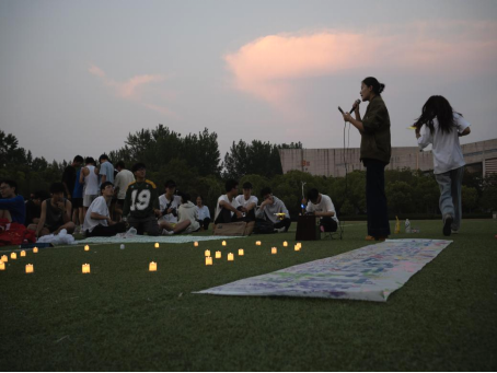 天色渐暗,户外的草地上荧光摇曳,点点暖光在绿草间闪烁,营造出温馨浪漫的氛围。活动接近尾声,参与者陆续抵达终点,同学们欢聚一堂,准备迎接最终的贴纸获取,参与唱歌,获取贴纸。夕阳西下,优美的歌声回荡在校园,欢呼声此起彼伏,参与者们脸上洋溢着期待的笑容。此刻,像是一场充满青春活力与温情的户外派对,传递出轻松愉悦、自由随性的气息。