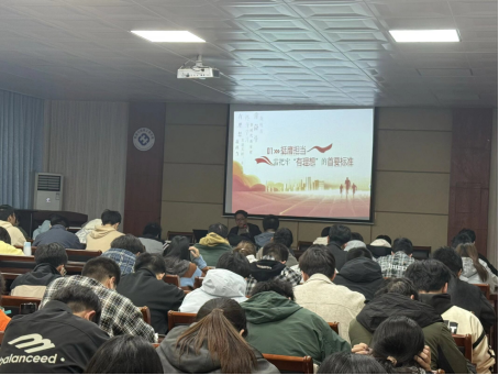 王云飞以梁启超《少年中国说》启幕,引导学生思考新时代使命,并围绕“有理想、敢担当、能吃苦、肯奋斗”展开阐述:他借马克思与青年毛泽东的范例,强调青年应将个人理想融入民族复兴的中国梦;深入剖析责任内涵,要求团员以担当精神履行职责;重新定义“吃苦”为成长的宝贵财富,鼓励在攻坚克难中锤炼品格;最后指出奋斗是青春底色,号召大家将信念化为行动,以专业学习、社会实践和服务群众践行初心,在实干中书写无悔青春。