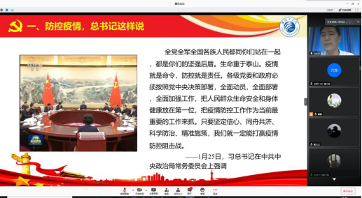 马从兵书记党课围绕学习贯彻习近平总书记关于疫情防控的系列讲话精神、在疫情大考中彰显中国特色社会主义制度优势、发挥党员先锋模范作用,抓紧抓实抓细常态化疫情防控工作展开。