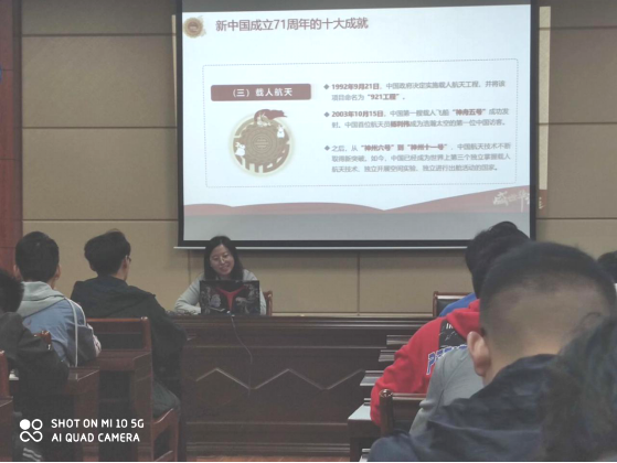 戴老师以“盛世华诞——庆祝新中国成立71周年”为中心,围绕新中国成立71周年的10大成就,71年的光辉历程,五大圆梦工程,71年伟大的奇迹,71年来的历史启示等方面展开介绍了中国成立以来的种种辉煌成就,激发了同学们浓浓的自豪感,加深了对祖国的热爱之情。最后戴老师激励同学们要从新中国71年历史中汲取营养,汲取智慧,开启更为光辉的历程,创造更为伟大的奇迹。