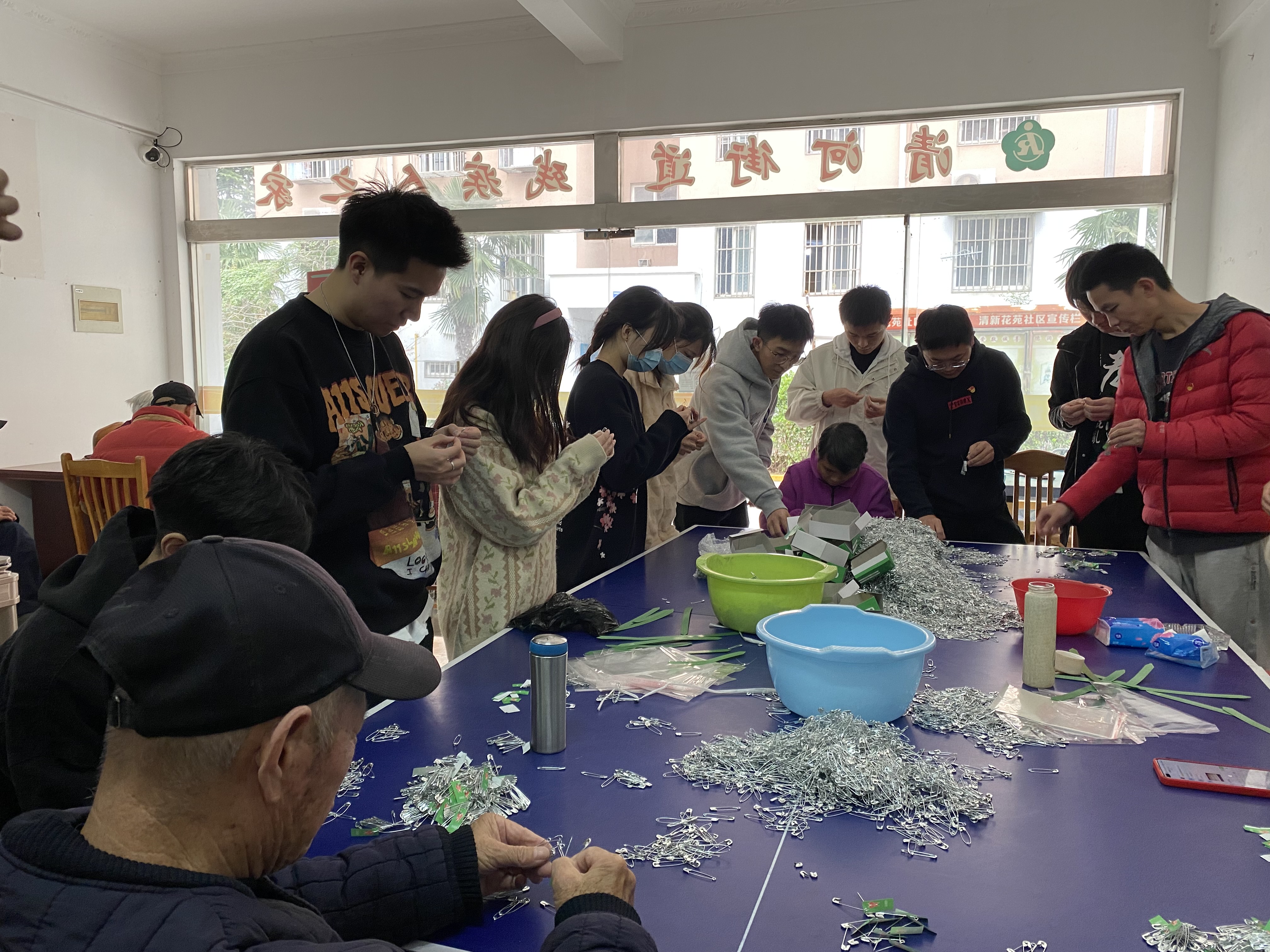 学生党员协助社区对群众提供志愿服务,帮助发放医用外科口罩、卫生手册等疫情防控物资,并对疫情防控生活方面的问题答疑解惑。在社区的残疾人之家,经社区范书记介绍,残疾人之家是政府的民生实事建设,这里为残疾人士提供简单的工种,既解决了智力、精神残疾人的生计,又减轻了家庭经济负担,是实实在在的公益事业。学生党员帮助他们,仔细地把一个个别针串起来,以实际行动传递温暖。