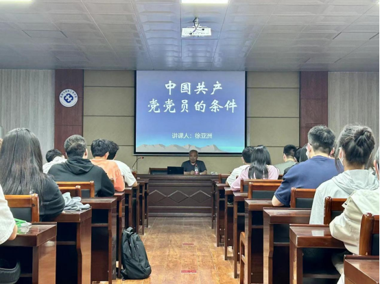 徐亚洲老师对入党条件进行四个方面的阐述:申请入党的条件、党员的基本条件、认真履行党员义务、正确行使党员权利。之后,徐亚洲老师对党员基本基本条件进行讲述阐述,阐述了党员是中国工人阶级的有共产主义觉悟的先锋战士。同时也对入党条件进行了详细的解释:承认党的纲领和章程,愿意参加党组织并在其积极工作,愿意执行党的决议,按期缴纳党费,这些条件都是入党不可或缺的。随后,徐老师提出党员在行使权利时,应先了解并学习党员权力内容,充分认识党员权利是党员参与党内事务的保障,并注重行使权力时碰到的一些问题。