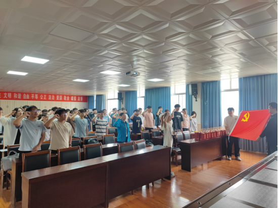 “我志愿加入中国共产党,拥护党的纲领,遵守党的章程……”毕业生党员们在学院党委副书记王明霞的带领下举起右拳,庄严宣誓,重温入党誓词。一句句铿锵有力的誓言,在活动现场久久回荡,唤醒了党员们入党时的初心与使命,让他们更加坚定为共产主义事业奋斗终身的信念。