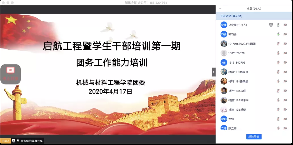 417日晚7:00,williamhill英国在腾讯会议APP发起启航工程暨学生干部培训第一期之团务工作能力培训大会。团委副书记郭巧会及学院主要学生干部共104人参加了此次培训会。