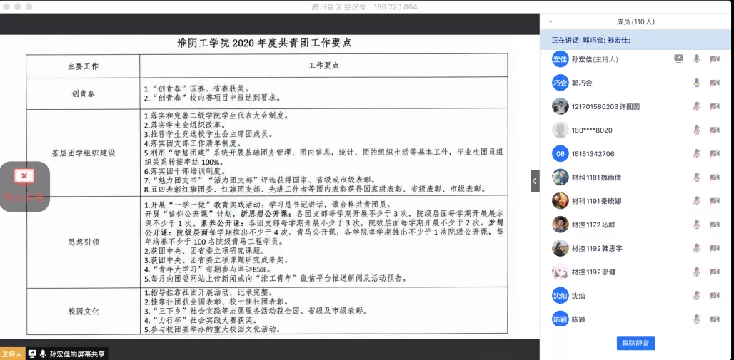 郭巧会副书记以“创青春比赛、基层团学组织建设、思想引领工作、校园文化建设”四个方面陈述2020年校共青团工作要点,并围绕智慧团建、青年大学习、“学社衔接”等工作对广大学生干部提出四点要求:一是总结经验,严格做好团支部书记的考核工作;二是强化观念,明确工作职责,坚持求真务实的工作作风;三是及时跟进,密切关注共青团的各项工作,对不足的地方及时查漏补缺;四是提前规划,借助团内资源,明确共青团工作导向。