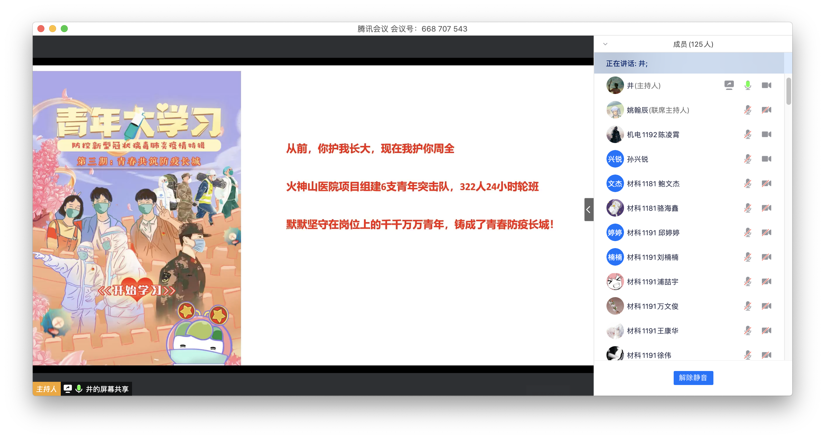 51日晚700,williamhill英国在腾讯会议APP开展“绽放战疫青春 坚定制度自信”主题信仰公开课,暨第二十四期团课培训第五讲《坚定制度自信 彰显青年担当》。本次培训会主讲人为团委副书记郭巧会2018级与2019级学生共123人参加了此次团课。