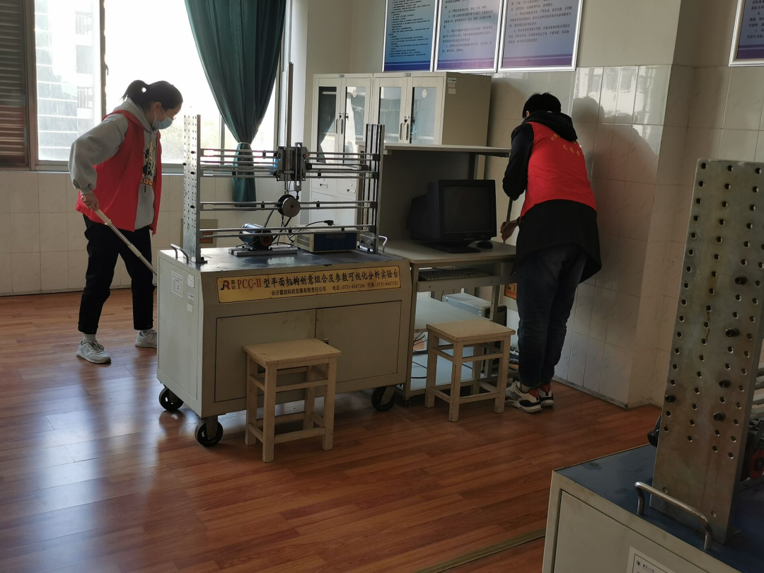 活动伊始,志愿者们与学校清洁人员进行了简单的分工,清洁工作重点包括实验室的地面清洁和实验仪器的整理。志愿者们热情高涨地投身到清扫活动中,不放过任何一个死角,充分展现了机材学子吃苦耐劳、阳光向上的精神状态。在大家不怕苦、不怕累的共同努力下,整个实验室焕然一新。