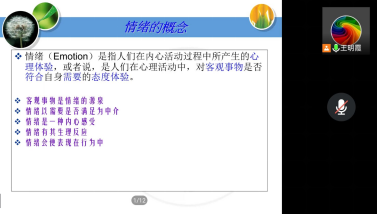 王明霞老师通过线上关注、交流大学生在疫情期间的心理健康,理论结合实际,讲解情绪的四个特点及其特性,分析疫情防控背景下的学生心理健康调节方法,帮助同学缓解来自线上学习、居家隔离、防护抗疫等多方面的压力并解决相关困扰。