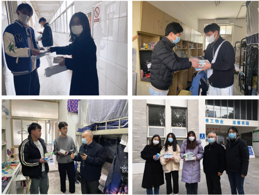 在发放抗疫物资中,几位老师和同学们进行交流,询问同学们当前的困难,叮嘱同学们严格遵守学校疫情防控相关规定,配合学校相关疫情防控管理工作,同时要做好宿舍卫生、个人防护,保持室内通风。