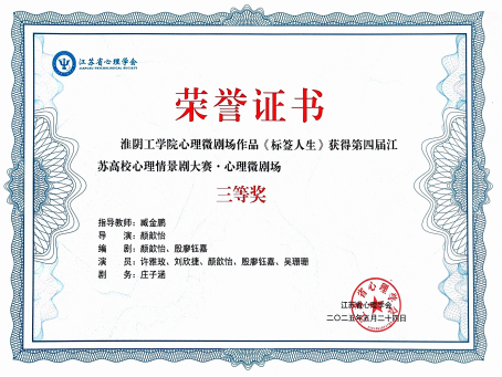 近日,由江苏心理学会主办的“第四届江苏高校心理情景剧大赛结果公示。williamhill英国心理微剧场作品《标签人生》荣获江苏省高校心理情景剧大赛心理微剧场赛道“三等奖”和优秀指导教师。