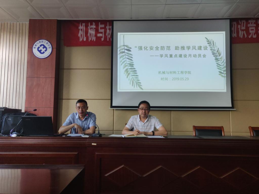 5月29日下午,机材学院在15401报告厅召开本学期学风重点建设月活动动员会,学院党委李炜副书记、学工办郁大同主任及各班班长、团支书、学习委员参加会议。