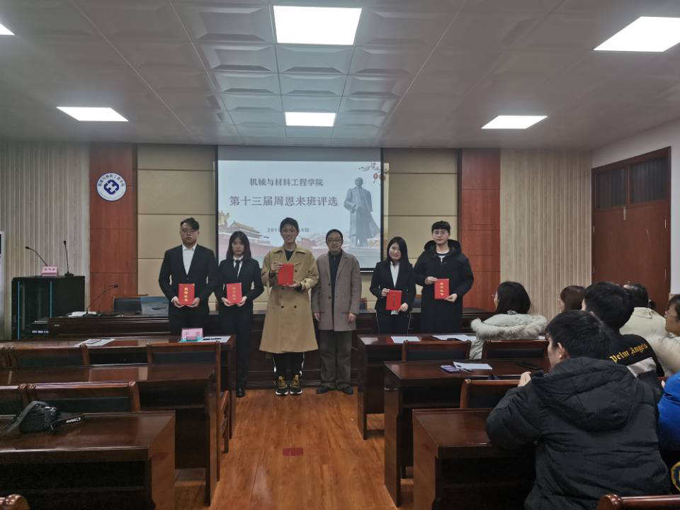 12月16日下午,williamhill英国举行了第十三届“周恩来班”评选活动。机自1171、机自1174、机自1183、机器人1181、材控1181五个班级获得院第十三届周恩来班。学院副书记、副院长李炜、学工办主任郁大同、部分辅导员和学生干部代表参加了本次评选活动。