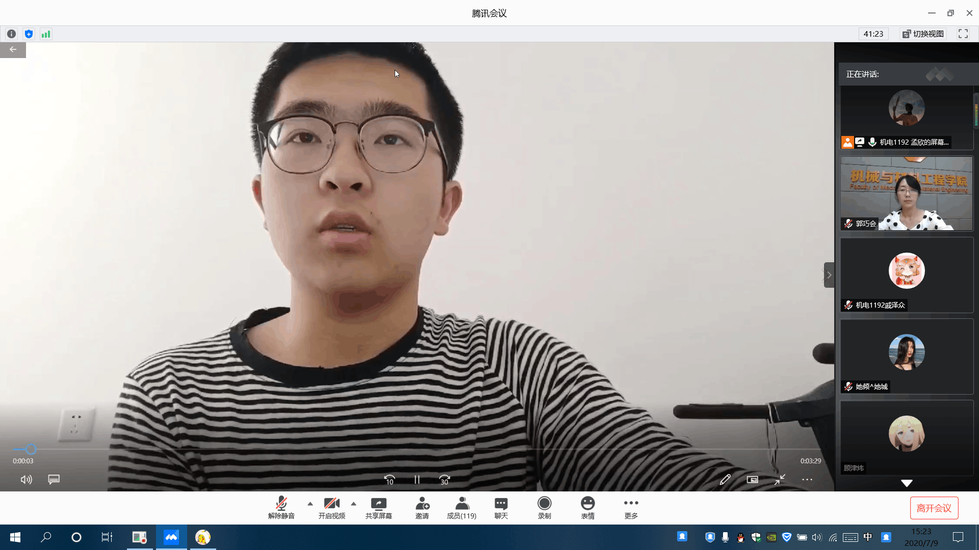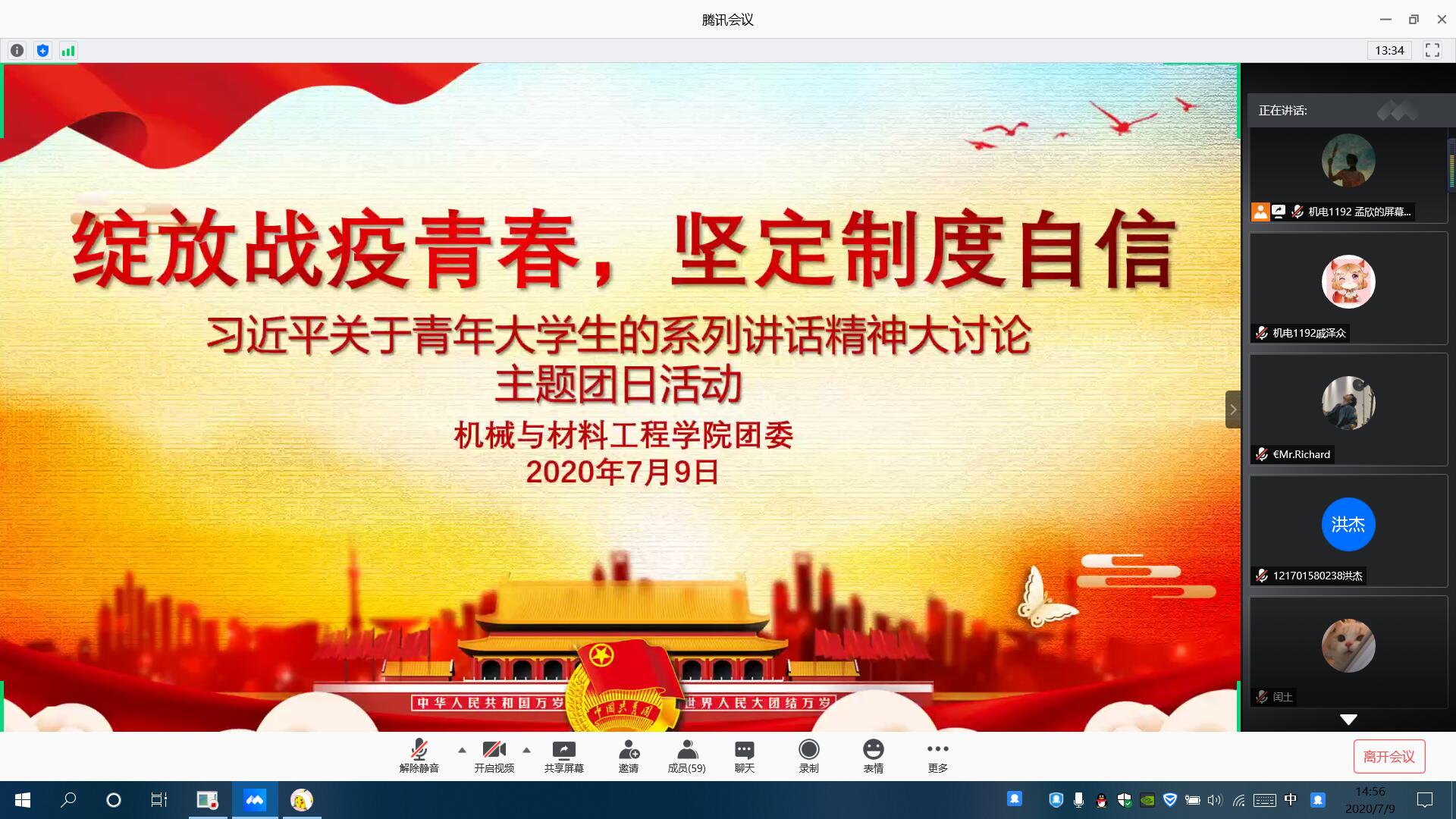 7月9日下午3:00,williamhill英国在腾讯会议APP开展“绽放战疫青春,坚定制度自信”主题团日活动,围绕习近平总书记关于青年大学生系列讲话精神进行大学习大讨论。学院团委副书记郭巧会老师和120位优秀团员参加本次活动。