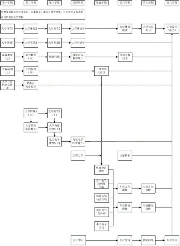 工程制图、工程力学、机械设计基础、机械制造技术基础、电工电子技术、控制工程技术,传感器及测试技术、工厂电气控制及PLC、机器人学,机器人驱动及控制。