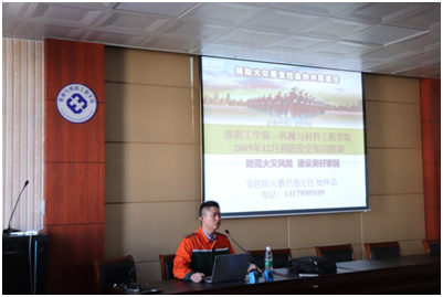 为切实推进学院安全管理各项工作,将学院安全生产责任制落到实处,2019年12月4日下午,学院邀请了安居防火教员部杨怀志主任为全院教职工开展了一场题为《防范火灾风险、建设美好家园》的消防安全培训。
